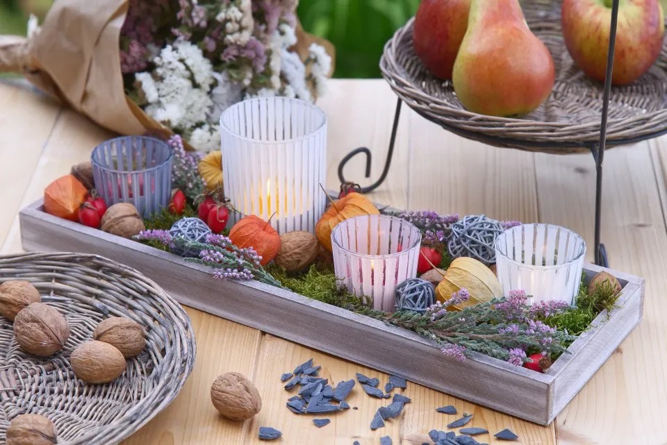 Je čas ozdobiť vonkajšie hrantíky, uviazať vence, nazdobiť vázy. Ani rodinný stôl nemožno nechať bez dekorácií. Jesenný čas strávený pri teplých kachliach patrí k milým okamihom. Spríjemnite si ich svetlom sviečok, bezpečne uzavretých v malých sklenených kalíškoch. K aranžmánu si pripravte: